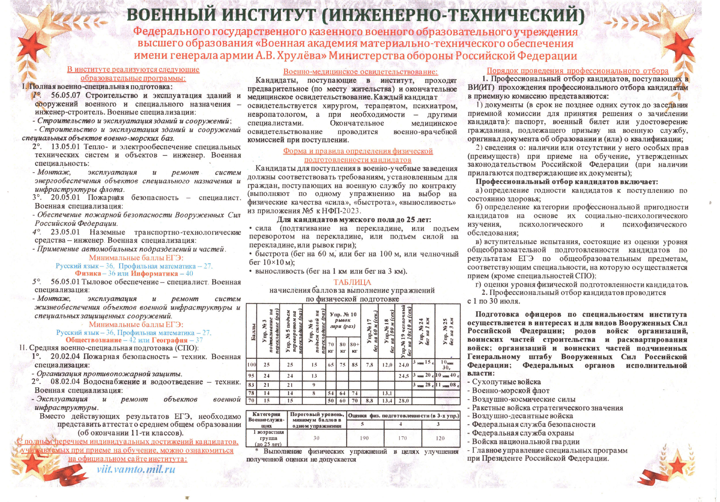 Военный институт (инженерно-технический) Военной академии материально-технического обеспечения имени генерала армии А.В.Хрулева – уникальное и единственное в своем роде высшее военное учебное заведение, выпускающее специалистов по инженерным специальностям двойного назначения. Выпускники института уже более 85 лет с честью и достоинством выполняют